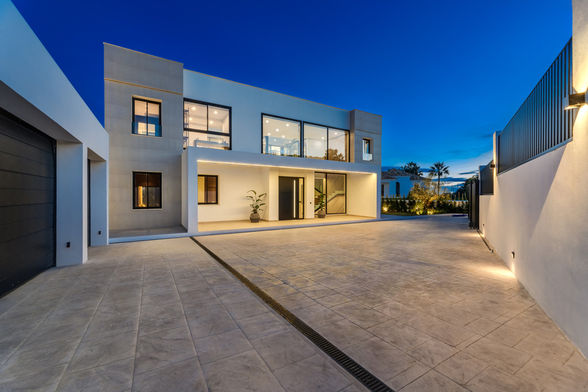 This contemporary villa in Madroñal, Benahavís offers breathtaking panoramic sea views within an exclusive gated community with 24-hour security.
